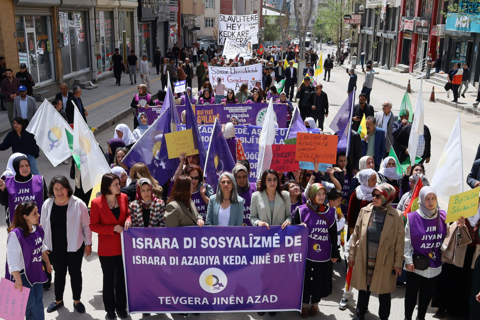 İnsanlar bu ülkede büyük bir açlık yaşıyor. Açlık sınırının 24, yoksulluk sınırının 78 bin TL olduğu bir ülkede, insanlar 22 bin TL ile geçinmeye mahkum ediliyor. Çünkü bu ülkenin ekonomisi savaşa ve güvenliğe gidiyor. Ülkede bu kadar krizin olmasının nedeni savaş politikalarıdır. Savaş ve güvenlik politikaları hem ekonomiyi hem siyaseti hem de tüm yaşamımızı etkiliyor. AKP döneminde tanıklık ettik. Bu ülkede üreticiler ürettiklerini satamıyor. Bu ülkenin ekonomisi savunma sanayi üzerine dönüyor. Bu sanayi AKP yanında olan birkaç kişinin karnını doyuruyor. İnsanlık tarihi emeğin tarihidir. Kadınların, gençlerin ördüğü bu emek her yerde söz sahibi olmalıdır. Kapitalist sistemin ezilen halklara reva gördüğünü biz asla kabul etmedik. Binlerce insan bunun için bedenlerini feda ettiler. İnsanca bir yaşam, halkların bir arada yaşaması mümkündür. Mümkün olmadığını söyleyenler bu iktidar ve savaştan beslenenlerdir. Her gün Türkiye ve Kürdistan’da 4 işçi hayatını kaybediyor. Bunun önünü geçmek için barış ve demokrasi mücadelesini buluşturmak gerekiyor.