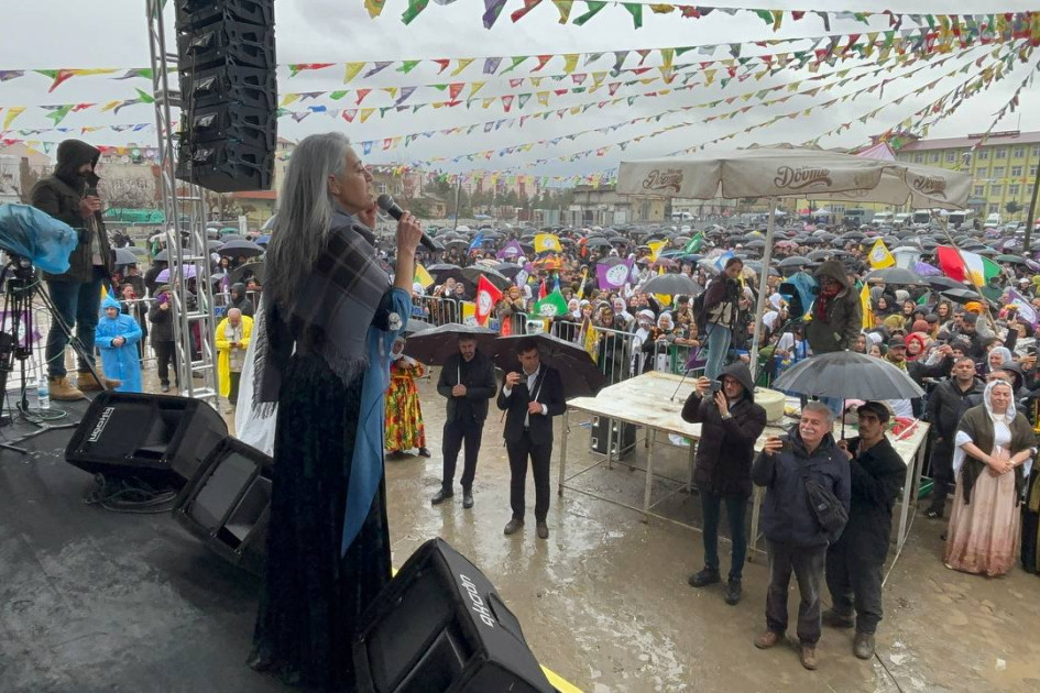 Uçar, “Newroz sadece bir takvim değil. Kürt halkı binlerce yıldır ateşi yakarak isyanını, itirazını dile getirdi. Newroz tüm ezilenlerin itirazıdır. Bu itirazla bugün coğrafyada nasıl bir çözüme gidildiği konuşuluyor. Kürtlerin inkar edildiği yıllardan sonra, inkarı karar altına alan meclis; inkarın yerine neyi koyacağını tartışıyor. Bu ülkenin hukukunda Kürtler, Aleviler, kadınlar yok. Kürt halkı diyor ki, ‘Hukukunu değiştirmek zorunda ve bu hukukta ülkenin kurucu halkı Kürt halkı yer alacak, eşit vatandaş olacak. Anadil benim kimliğimdir, anadilimde yaşamak istiyorum’ diyor. Meclis’te Kürtçe konuştuğumuzda mikrofon kapatılıyor. Sayın Öcalan’ın paradigmasının hayat bulduğu Rojava’da durduruldu. Rojava halkı, ‘Savaşmayacağım müzakere edeceğim, diploması yürüteceğim’ dedi ve kazandı. Kürtler tek slogan etrafında bir araya geldi. Bu sloganı bize attıran Rojava halkının direnişiydi. ‘Rojava Rojhilate, Kürdistan yek welat e’ sloganı. Direnciniz daim olsun.” dedi.