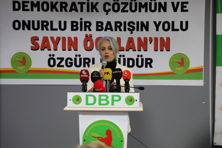 Türkiye’nin yaşadığı ve halklara dayattığı yüzyıllık sorunların her birinde çözüm gücü olacak toplumun dinamiklerini ve demokratik gücünü açığa çıkarmak istiyoruz. Türkiye, yaşadığı krizlerin Kürt sorunundan kaynaklandığını ve bunun üstünü örtecek bir fikir daha bulamıyor. O yüzden Kürt sorunun demokratik çözümü, Türkiye’nin başat sorunudur. Bu ülkede faaliyet yürüten siyasi partilerin, söz kuran toplumsal kesimlerin, demokratik kitlelerin yüzünü iktidarın korku dünyasına değil, DBP’nin, DEM Parti’nin onlarla birlikte hareket eden ittifak ve demokrasi güçlerinin işaret ettiği o yeni hatta 3’üncü yol siyasetinde, güçlendirmeye çağırıyoruz. Artık Kürt meselesi sadece kürsüde konuşabilecekleri, sıkıştıklarında bahsedilecek bir mesele değildir. Türkiye’nin demokratik inşasında ilk adım nedir diye soracaksanız; Kürt sorunun demokratik çözümüdür. Kürt sorunun demokratik çözümü de Kürt Halk Önderi Sayın Abdullah Öcalan esas muhatap alınarak, özgürlüğünün sağlanmasındadır. Bu mücadeleyi yürütürken yalnız kalmadık. Sayın Öcalan’ın özgürlüğü ve ülkenin demokrasisi için elimizden geleni yapmaya hazırız.
